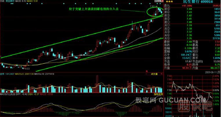 3、突破回踩有效。突破后,股票價(jià)格會(huì)自然回落,重新回到原來(lái)的上升通道的上軌附近,這個(gè)過(guò)去的阻力線(xiàn)現(xiàn)在變成了一個(gè)支撐。當(dāng)不破原通道上軌,並且準(zhǔn)備反身向上的時(shí)候,是一個(gè)突破買(mǎi)點(diǎn)更安全的買(mǎi)點(diǎn)。這就是回踩確認(rèn)有效的介入點(diǎn)。