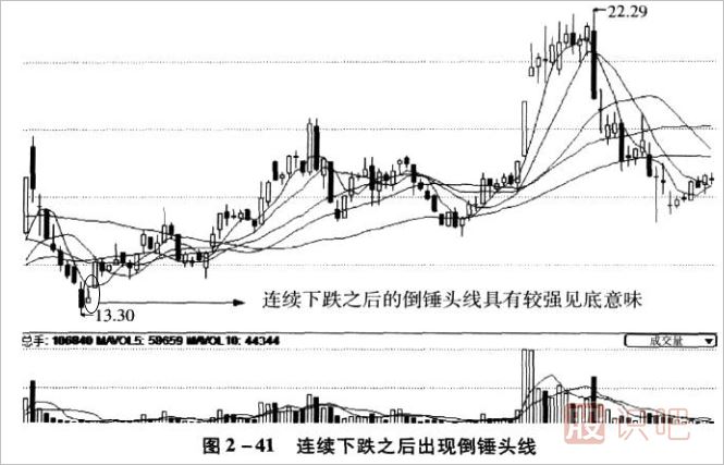 如果倒錘頭線出現(xiàn)在股價大幅下跌之后,往往是股價見底的信號,此時空方雖然仍占據(jù)主導(dǎo),但盤中多頭主力已經(jīng)開始嘗試反攻。一旦見底則意味著被大多數(shù)投資者認(rèn)同,股價止跌并由降轉(zhuǎn)升的概率就比較大,如圖2-41所示。