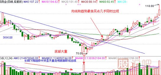 紅日藥業(yè)(300026)2009年10月底上市,隨后主力一直在打壓吸籌,從上圖看股價(jià)下跌中地量結(jié)構(gòu)明顯。但2010年2月1日成交量突現(xiàn)天量,這說(shuō)明超級(jí)主力已經(jīng)進(jìn)場(chǎng)掃貨,2月26日箭頭所指處均線最佳買點(diǎn)和趨勢(shì)買點(diǎn)同時(shí)出現(xiàn),這時(shí)底部才得以最終確認(rèn),此時(shí)投資者可大膽進(jìn)場(chǎng)掃貨。