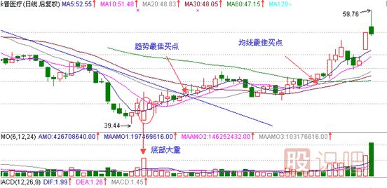 樂(lè)普醫(yī)療(300003)在2009年10月上市后股價(jià)處于長(zhǎng)期整頓期。從上圖看地量結(jié)構(gòu)明顯,但2010年2月日出現(xiàn)了底部大量的仙人指路K線形態(tài),兩天前還有一個(gè)金針探底出現(xiàn)。我們約莫估計(jì)這就是底部區(qū)域,當(dāng)然穩(wěn)健的投資者還是等箭頭一趨勢(shì)最佳買點(diǎn)和箭頭二均線最佳買點(diǎn)出現(xiàn)后再入場(chǎng)比較妥當(dāng)。