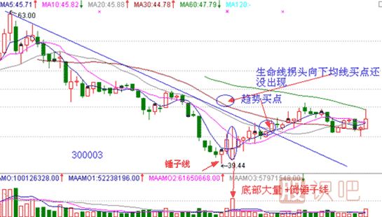 300003,樂(lè)普醫(yī)療,2010年1月28日出現(xiàn)了金針探底的特殊形式錘子線,隨后第三天2月1日就是我們傳說(shuō)中的倒錘子線,而且伴有底部大量出現(xiàn),金針探底+倒錘子線組合是我研究中的必漲組合,由于底部大量的出現(xiàn),當(dāng)日實(shí)盤(pán)講解時(shí)就斷定此底部形態(tài)成立,后期越過(guò)阻擋線出現(xiàn)了趨勢(shì)買(mǎi)點(diǎn),但生命線拐頭現(xiàn)在仍然向下,決策線壓制股價(jià)明顯,穩(wěn)健投資者仍然需要耐心等待。