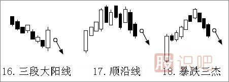 此處所稱的順沿線是指自高檔順次而下出現(xiàn)的二根陰線。為了打擊此二根陰線所出現(xiàn)的一大根陽線,看起來似乎買盤力道增強(qiáng)了,但投資人須留意這只不過是根“障眼線”,主力正在拉高出貨,也是投資人難得的逃命線,宜做空。