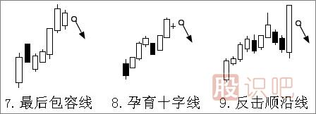 持續(xù)漲升的行情一旦出現(xiàn)此圖形,表示上漲力道即將不足,行情將回檔盤整,投資人宜先行獲利了結(jié)。這也是一種“障眼線”,小陽線并沒有超越前一日的最高點(diǎn),證明上漲乏力,行情下跌。