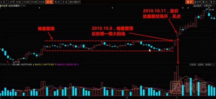 2.股價在縮量整理的過程中出現(xiàn)一根大陽線。