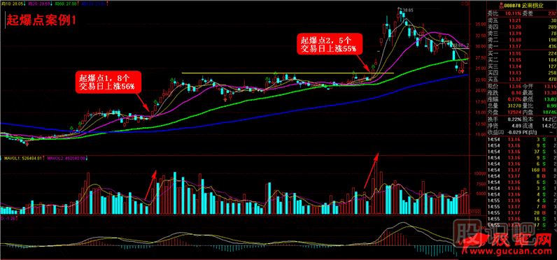 根據(jù)起爆點所處位置的不同,可以分為陽起爆和陰起爆。所謂陽起爆就是在中長線趨勢向上的上漲過程中,回調結束再次上漲時所產(chǎn)生的起爆點,往往可靠性較高,且起爆后漲幅較大;而陰起爆則是在中長線趨勢向下的過程中,由于超跌反彈所產(chǎn)生的起爆點,往往可靠性低,且起爆后漲幅也不大。本系列所講的起爆點均為超級黑馬起爆點,即陽起爆。