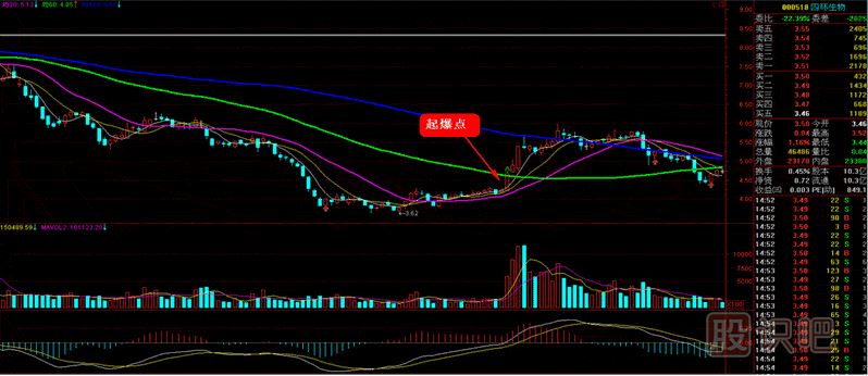 由上圖可知,當股價經(jīng)過下跌、調整或橫向盤整后,某一天突然出現(xiàn)放量上漲的中陽或大陽反轉K線,股價原有的趨勢即將或已經(jīng)被打破,則該K線稱為起爆點。起爆點在市場中的意義重大,往往意味著下跌、調整的結束和上漲的開始,是趨勢改變的轉折點,是上漲的萌芽K線。投資者抓住了起爆點也就意味著一建倉就可以立即在短期內獲取暴利,減少了等待的時間,極大的提高了資金的利用率。