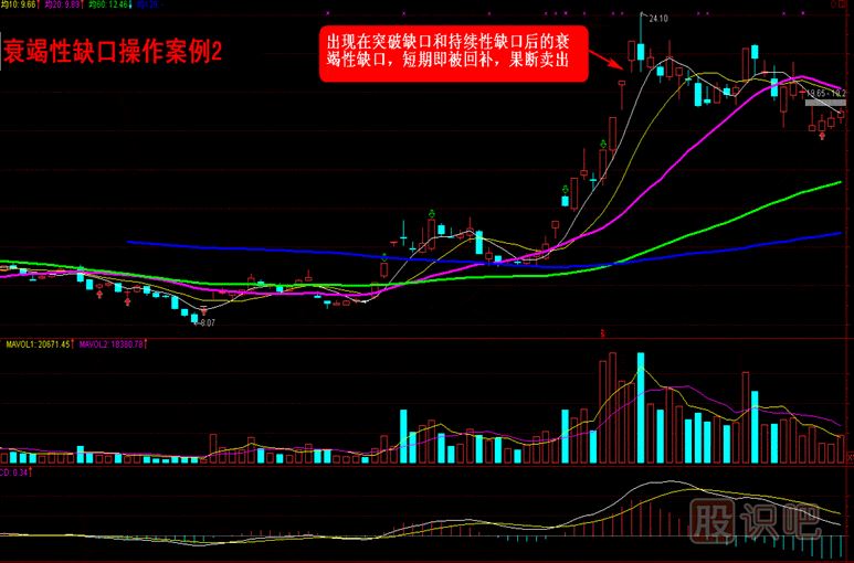 對于衰竭性缺口的操作來講,在上漲末期出現(xiàn)的衰竭性缺口要及時(shí)賣出,同時(shí),理論上講,在下跌末期出現(xiàn)的衰竭性缺口要及時(shí)買入,但實(shí)盤操作過程中,建議趨勢完全轉(zhuǎn)好后順勢而為,而不建議在趨勢并未見明顯好轉(zhuǎn)時(shí)進(jìn)行抄底操作。