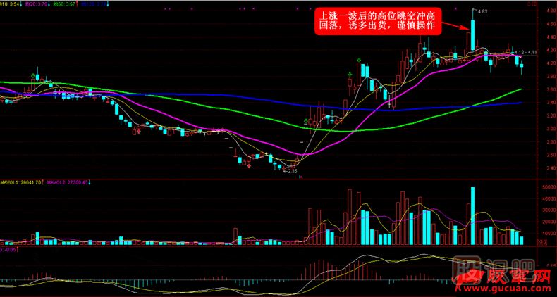③在強(qiáng)勢拉升一波后的高位的跳空突破缺口也要慎重操作,以防止莊家誘多高開沖高向下瘋狂拋售
