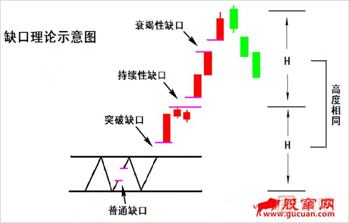 缺口的出現(xiàn)往往伴隨著向某一個(gè)方向的一種較強(qiáng)動(dòng)力。缺口的高度代表著運(yùn)動(dòng)的強(qiáng)弱,缺口越高,運(yùn)動(dòng)的力度越大;缺口越低,運(yùn)動(dòng)的力度越小。不管向何種方向運(yùn)動(dòng)所形成的缺口,都將成為日后較強(qiáng)的支撐與阻力位,而這種支撐與阻力的強(qiáng)弱要根據(jù)缺口的形態(tài)來判斷。缺口的形態(tài)可以分為普通缺口、突破缺口、持續(xù)性缺口與衰竭性缺口共四種形態(tài)。缺口理論示意圖如下: