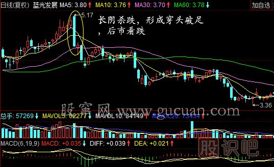 實(shí)例1:2009年11月,藍(lán)光發(fā)展(600466)還在穩(wěn)步上升階段,11月23日收出一根溫和量能的陽線,第二天股價順勢高開,很多興奮的投資者便迫不及待地追高買入,但買家剛沒興奮多久,股價便急轉(zhuǎn)直下,由升轉(zhuǎn)跌,大幅殺跌至當(dāng)時收盤,K線形態(tài)上形成了穿頭破足的走勢。24日的大陰線將23日陽線的最高價和最低價全部包含,即比前一天最高價還高的價格開盤,比前一天最低價還低的價格收盤。此后,股價便開始了連續(xù)的調(diào)整,如圖所示。