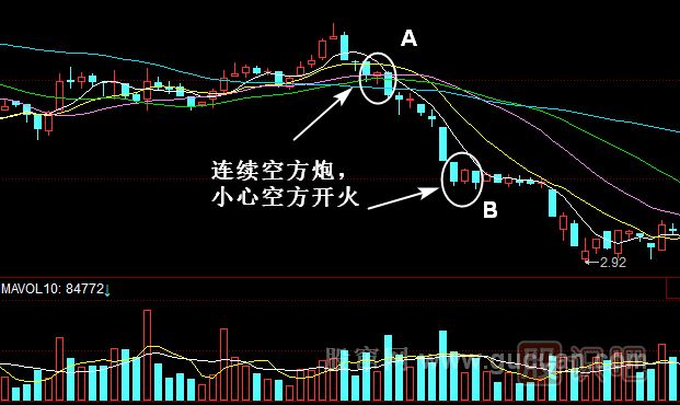 多空轉換往往發(fā)生在一瞬間,多方炮時看漲的信號,但時如果多方炮收出后股價不漲反跌,那么馬上就形成了一組新的空方炮,空方取得支配力量,多頭雖有反攻但仍敗下陣來,所以其實組合空方炮就是由多方炮向空方炮演變的“樂極生悲”。股價極有可能會形成“多轉空”,從而形成“多殺多”(多殺多指本來大家時看多買漲的,但由于買入被套后反手賣出,形成多頭殺多頭的局面)。