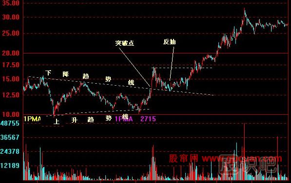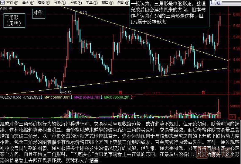 (5)對稱三角形突破后,可能會出現(xiàn)短暫的反方向移動(反抽),上升的后抽止于高點(diǎn)相連而成的型態(tài)線,下跌的后抽則受阻于低點(diǎn)相連的型態(tài)線之下,倘若股價(jià)的后抽大于上述所說的位置,型態(tài)的突破的可能有誤。