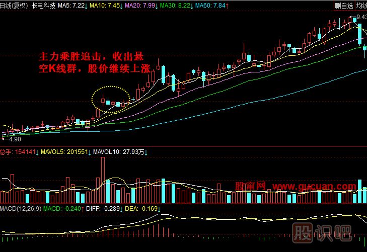 3.乘勝追擊個(gè)股在懸空K線群后的放量陽(yáng)線當(dāng)日介入。