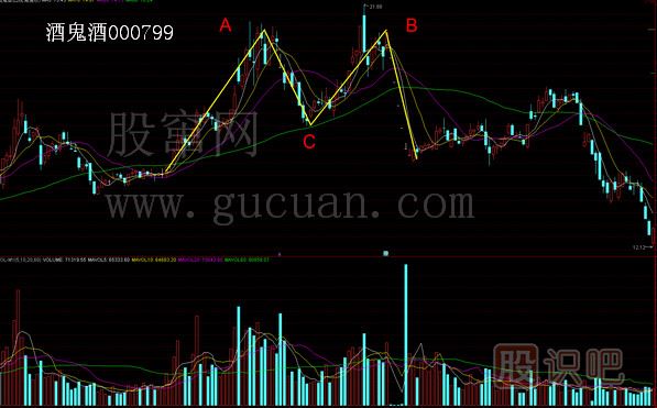 酒鬼酒(000799)在2015年3月12號(hào)到11月2號(hào)走出一個(gè)雙頂M頭,AB分別代表M的兩個(gè)高點(diǎn),C是反彈點(diǎn),C點(diǎn)在60日均價(jià)線(xiàn)位置。好多個(gè)股我們會(huì)錯(cuò)過(guò)低點(diǎn)到A點(diǎn)的上漲,但是在形成M頭的過(guò)程中,C點(diǎn)到B點(diǎn)的這段我們是可以進(jìn)行操作的,C點(diǎn)位的選擇就是看股價(jià)在哪根均價(jià)線(xiàn)(MA20、MA30、MA40、MA60等)附近得到支撐,一旦有支撐反彈,那么就耐心持股等待B點(diǎn)的出現(xiàn),完美的低吸高拋。而C點(diǎn)到B點(diǎn)的過(guò)程往往會(huì)形成MACD指標(biāo)的水上第二次金叉。