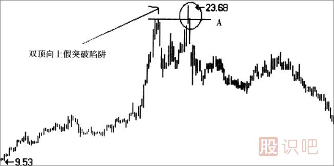 在雙頂中,我們會(huì)遇到第二波峰高于第一波峰的情形:市場(chǎng)價(jià)格在作第二次沖鋒時(shí),竟然越過(guò)了第一個(gè)峰位的阻力,但就在市場(chǎng)正預(yù)期它會(huì)將上升趨勢(shì)進(jìn)行到底的時(shí)候,趨勢(shì)卻出人意料地發(fā)生了逆轉(zhuǎn),造成第二峰的高度與第一個(gè)峰的高度不相等,且第二峰高過(guò)第一峰。這就是我們常說(shuō)的“多頭陷阱”。這種多頭陷阱常常出現(xiàn)在中國(guó)股市的一些著名莊股中。