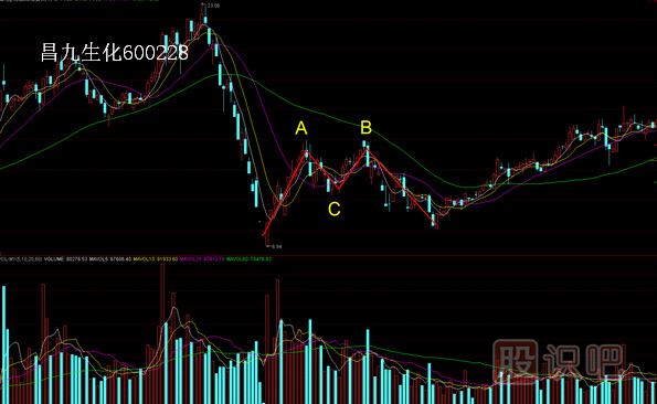 昌九生化(600228)形成的M頭在下跌的反彈位置,此時(shí)C點(diǎn)到B點(diǎn)處的機(jī)會(huì)風(fēng)險(xiǎn)是很大的,從圖中可以看出,B點(diǎn)的位置距離綠色的60日均價(jià)線(xiàn)非常近,而60日均價(jià)線(xiàn)的角度向下。該股還好B點(diǎn)調(diào)整到前期低點(diǎn)6.94元附近有一個(gè)反彈上漲,好多個(gè)股在B點(diǎn)開(kāi)始調(diào)整就會(huì)飛流直下