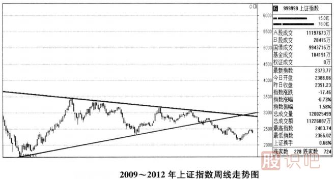 如上圖,是2009-2012年上證指數(shù)周線走勢圖,從圖中我們清楚地看到股指周線形成了一個很大的三角形形態(tài)。比較熟悉掌握三角形形態(tài)的投資者就可以判斷出,股指在2/3的位置并沒有形成向上突破,這時就應(yīng)該保持謹(jǐn)慎了。果然,在多次觸及三角形的上方突破未果之后,2011年股指展開了大幅殺跌。