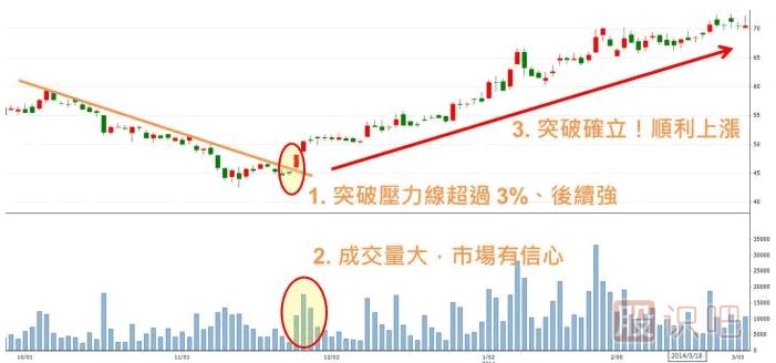 當股價突破或跌破趨勢線時,成交量往往也會放大,