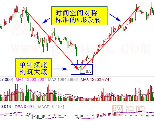 在一波下跌行情的末段,市場(chǎng)中的悲觀情緒明顯升溫,股價(jià)加速下行,基本呈自由落體下跌,新低連接出現(xiàn),恐慌盤不斷涌出。就在這時(shí),該股于某日突然止跌反彈,形成了一個(gè)尖底。接下來(lái)的數(shù)個(gè)交易日里,久違了的買盤紛紛進(jìn)場(chǎng)拉升股價(jià),使股價(jià)迅速脫離底部,并且股價(jià)單邊上漲,拒絕回調(diào),股價(jià)上升的角度與加速下跌時(shí)正好對(duì)稱,做多的力度也與此前空方的打壓力度基本相等。從走勢(shì)上看,急跌急漲的過(guò)程在K線圖上留下了一個(gè)大大的V字形運(yùn)行路線,V形底因此得名。(如圖)