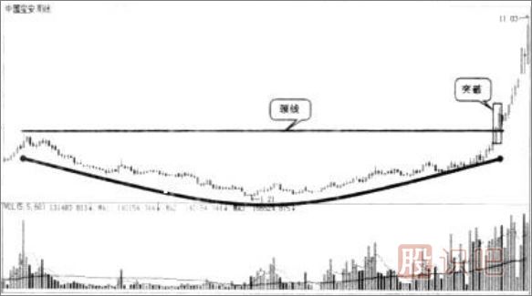 一般而言,圓弧底是在大市處于盤整期并經(jīng)主力打壓后形成的。股價(jià)下跌一段時(shí)間后,拋盤減少,主力就慢慢收集籌碼,不急于推高股價(jià)。這時(shí),隨著拋壓的減輕,成交量縮小。當(dāng)主力還要增加吸籌量時(shí),又不得不慢慢抬高價(jià)格,于是成交量也隨著價(jià)格的上升而不斷放大。