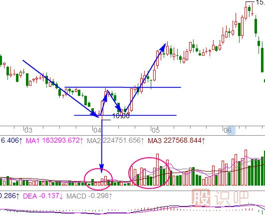 4.雙底中第二個(gè)底部成交量十分小,但在突破頸線時(shí)必須得到成交量放大的配合方可確認(rèn)。
