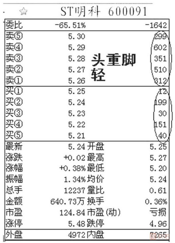 圖3-2就是ST明科(600091)在2011年11月11日收盤時的盤口。賣①到賣⑤都是過300手的大單,買①到買⑤均為100手左右的小單,屬于上壓板的情況。