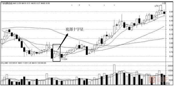 底部十字星的技術(shù)含義是:股價(jià)經(jīng)過(guò)大幅回落后,做空能量已大量釋放,股價(jià)無(wú)力再創(chuàng)新低,呈現(xiàn)底部回升態(tài)勢(shì),這是較明顯的大市轉(zhuǎn)向信號(hào)。投資者見(jiàn)此信號(hào),再結(jié)合其他技術(shù)指標(biāo),可考慮適量買進(jìn)。