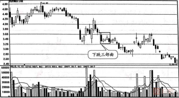 (1)在下跌行情初期或下跌趨勢途中出現(xiàn)的下跌三部曲,第一根陰線的出現(xiàn)應(yīng)當伴有放量。 隨后持續(xù)出現(xiàn)的小陽線反彈應(yīng)當是縮量,這樣的量價配合,更說明股價屬于弱勢反彈。