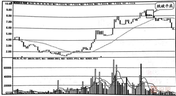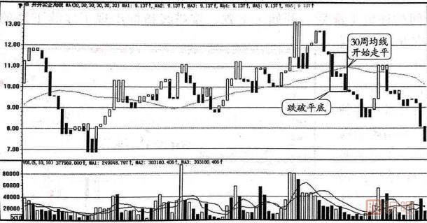 跌破平底是指股價(jià)經(jīng)過長時(shí)間的大幅上漲(一般漲幅要求超過50%)后,寶塔線指標(biāo)在30周均線上方出現(xiàn)跌破平底,即最后一周的K線收盤價(jià)跌破了前周的收盤價(jià),如圖1-9所示。接下來由股識(shí)吧來探究寶塔線指標(biāo)跌破平底賣出,大伙兒一起看文章內(nèi)容。