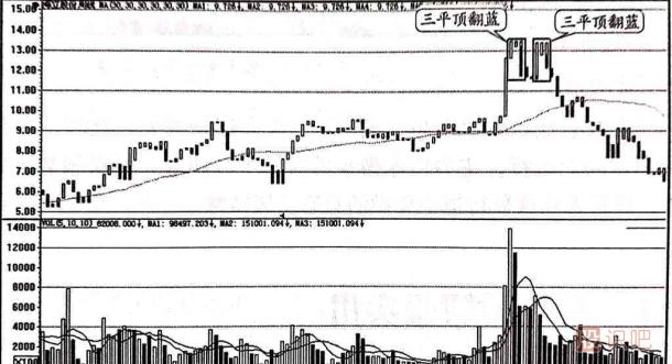 三平頂翻藍(lán)是指在周K線中,當(dāng)股價(jià)經(jīng)過一段時(shí)間的上漲(一般漲幅要求超過50%)后,寶塔線在30周均線上方出現(xiàn)第一次或者第二次的三平頂翻藍(lán),即在連續(xù)的三根周K線中,最后一周的收盤價(jià)向下跌破了第二周的收盤價(jià),如圖1-7所示。接下來由股識(shí)吧來給妳說寶塔線指標(biāo)三平頂翻藍(lán)賣出,由小編來為大伙兒剖析一下。