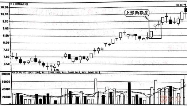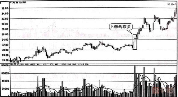 上漲兩顆星屬于常見的上漲中繼形態(tài),一般出現(xiàn)在大行情的初期。 大陽線之后連續(xù)出現(xiàn)勢均力敵的信號意味著多空雙方的力量在新的條件下取得了平衡,空方?jīng)]有打壓股價的力量,多方的勝利被鞏固了,投資者對股價的上漲已經(jīng)取得了共識,大陽線取得的成果已經(jīng)得到市場的認(rèn)同,這往往是股價大幅度攀升的先兆。