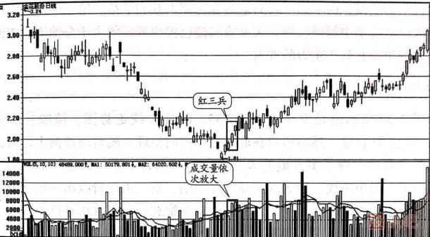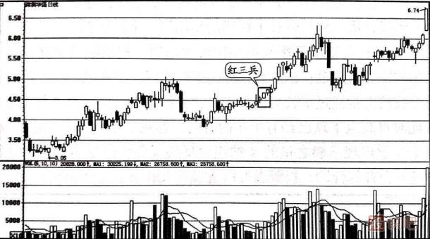 紅三兵中每一天的收盤價都在向上攀升并超過前一天的收盤價,股價穩(wěn)健地逐步向上,是一種極為常見的而且準(zhǔn)確性很高的上升形態(tài)。 當(dāng)股價運行經(jīng)過長時間的下跌之后,一旦在底部企穩(wěn),隨后又出現(xiàn)紅三兵的K線組合,說明此時市場上多方的能量正在不斷地聚集,后市股價極有可能出現(xiàn)大幅度上升,從此走出一波大行情來。