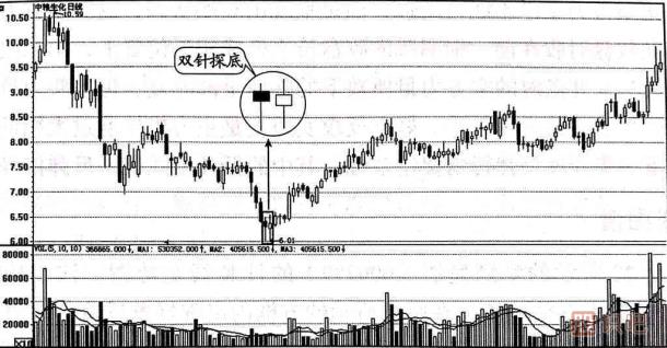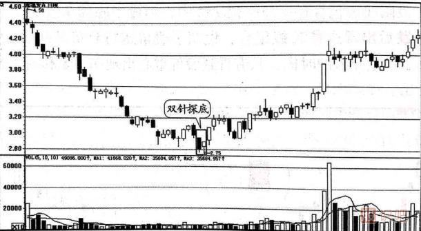 (1)雙針探底中的雙針,可以是緊密相連的兩根長(zhǎng)下影線,也可以是中間隔有幾條K線的雙針走勢(shì),但相隔的天數(shù)不能多于五個(gè)交易日。
