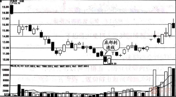 底部刺透線由兩根K線組成,第一根K線是實體較大的陰線,第二根K線跳空低開,開盤價遠(yuǎn)低于前一天的收盤價,但是不久后在買盤的推動下價格回升并且收盤價超過了第一根K線實體的一半以上,形成了一根低開高走的陽線,如圖1-3所示。接下來由股識吧來解釋多根K線底部刺透線買入,皇天不負(fù)有心人,看完下文終于讓你知道。