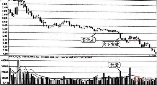 前低跌破賣出的原理是:由于主力莊家尚未完成全部的出貨動(dòng)作,大部分籌碼還未出來,需要通過制造一個(gè)反彈,讓散戶以為調(diào)整已經(jīng)結(jié)束而入場(chǎng)接貨,當(dāng)主力覺得籌碼出得差不多時(shí),終于露出了真實(shí)面目,兇狠的砸盤導(dǎo)致反彈前的低點(diǎn)被毫無抵抗地跌破。 此時(shí),前低點(diǎn)將會(huì)變成又一輪下跌的起點(diǎn),原來的支撐變成以后股價(jià)的強(qiáng)大壓力。