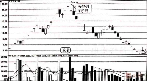 從頭部倒T字線的形狀中可以看出,在買賣雙方的爭斗中,一開始買方一度占據(jù)丁上風,但是在賣方的頑強抵抗之下,買方的力量持續(xù)減弱,最終退回到目口原先發(fā)動攻擊的地方。此時買方其實已經(jīng)是強餐之末,頭部倒T字線表明了賣方的潛在力量已經(jīng)得到了充分的積聚,股價隨時都會出現(xiàn)逆轉或者下跌。
