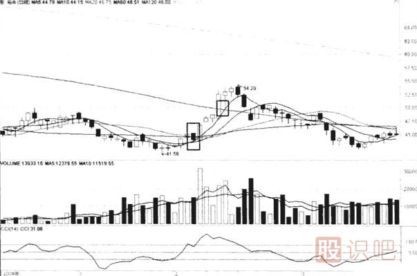 在圖中可以看到,在上漲到60日線附近時(shí)出現(xiàn)晚星,隨后下跌。