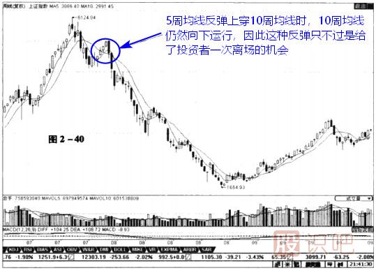 死亡交叉的出現(xiàn)表明行情已經(jīng)形成逆轉(zhuǎn),下降趨勢(shì)形成。雖然從圖中我們看到股指在反彈時(shí)5周均線又回到10周均線之上,但這種反彈并沒(méi)改變10周均線的運(yùn)行方向。10周均線繼續(xù)向下移動(dòng),因此這種反彈很快結(jié)束,股價(jià)繼續(xù)向下跌落,對(duì)于投資者來(lái)說(shuō),如能利用這次反彈離場(chǎng)便可逃脫被深套的命運(yùn)。見(jiàn)圖2一40。