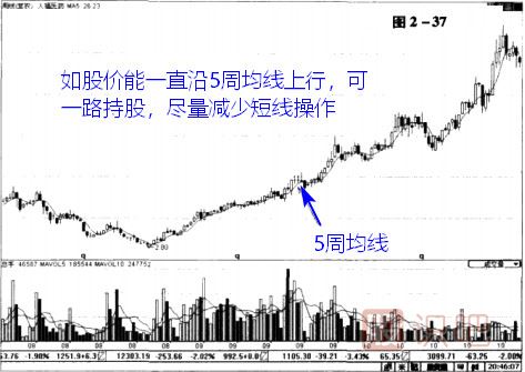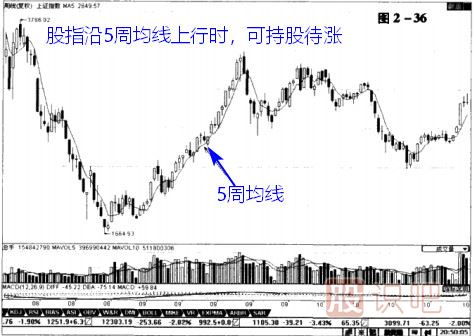 (2)只要指數(shù)能沿著5周線向上運(yùn)行,而手中所持個(gè)股也與大盤(pán)走勢(shì)相同或接近,投資者就可以一路持股做多,盡量避免線操作,以免因?yàn)轭l繁