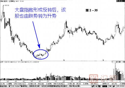 觀察圖2一37,,當(dāng)股指進(jìn)入新的上升趨勢(shì)后,此股也跟隨著大盤(pán)指數(shù)見(jiàn)底回升,進(jìn)入新的上升趨勢(shì)。當(dāng)股價(jià)站穩(wěn)5周均線之上后,在