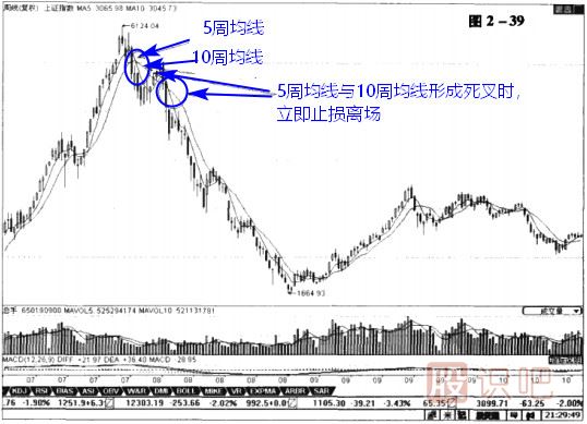 觀察圖2一39,當(dāng)5周均線向下拐頭并下穿10周均線時(shí),形成了死亡交又,