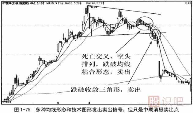 圖1一75是圖1一74中第一個賣出點前后的日線圖,圖中股價在頂部走出一個收斂三角形。三角形內(nèi)出現(xiàn)均線死亡交叉,打破均線粘合形態(tài).并隨之走出均線空頭排列,都是見頂或看跌的信號。多種賣出信號疊加,會讓熟稔技術(shù)分析的交易者心內(nèi)不安,至少會沽出一部分籌碼。