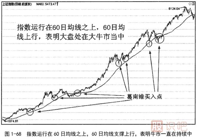 一般可以認(rèn)為:大盤指數(shù)運(yùn)行在60日均線之下,60日均線下行,是熊市;大盤指數(shù)運(yùn)行在60日均線之上,60日均線上行,是牛市。個(gè)股由于股價(jià)上下波動(dòng)的幅度和頻率都要大于大盤指數(shù),因此判斷個(gè)股的牛熊,除了參考60日均線之外,還需要其他趨勢(shì)分析方法配合使用。