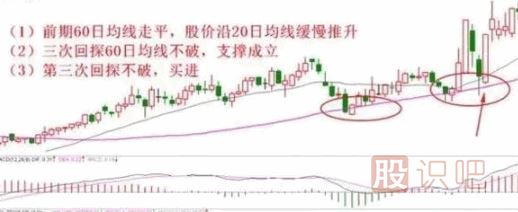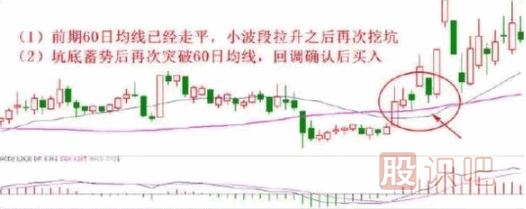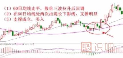 操作方法:個股在長期下跌后,股價第一次站上60均線,急進的投資者可以跟進,穩(wěn)健的投資者可以等到股價洗盤回調到60均線附近區(qū)域得到支撐買入,極其準確。