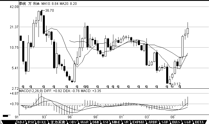 盤(pán)整背馳最有用的,就是用在大級(jí)別上,特別是至少周線級(jí)別以上的,這種盤(pán)整背馳所發(fā)現(xiàn)的,往往就是歷史性的大底部。配合MACD纏論完美教程全集給你說(shuō)盤(pán)整背馳與歷史性底部,這種背馳是很容易判斷的。這種例子太多,例如000002,誰(shuí)都知道該股是大牛股,但這牛股的底部,如果學(xué)了本ID的理論,是誰(shuí)都可以發(fā)現(xiàn)的。請(qǐng)看該股的季線圖,也就是三個(gè)月當(dāng)成一個(gè)K線的圖。1993年第一季度的36。7元下跌到1996年的第一季度的3。2元,構(gòu)成第一段,剛好前后13季度,一個(gè)神奇數(shù)字;1996年的第一季度然后到2001年第三季度的15。99元,構(gòu)成第二段,一個(gè)典型的三角形,中樞的第二段出現(xiàn)三角形的情況很常見(jiàn),前后23季度,和21的神氣數(shù)字相差不大;2001年第三季度下跌到2005年的第三季度的3。12元,前后剛好17周,神奇數(shù)字34的一半,也是一個(gè)重要的數(shù)字。第一段跌幅是33.5元,第三段是12.87元,分別與神奇數(shù)字34和13極為接近。因?yàn)?3的下一個(gè)神氣數(shù)字是21,加上前面說(shuō)過(guò)的17,都不可能是第三段的跌幅,因此,站在這種角度,萬(wàn)科的2.99元附近就是鐵底了。不過(guò)這種數(shù)字分析意義不大,最簡(jiǎn)單的判斷還可以用MACD來(lái),第三段跌破第一段的3.2元,但MACD明顯出現(xiàn)標(biāo)準(zhǔn)的背弛形態(tài):回抽0軸的黃白線再次下跌不創(chuàng)新低,而且柱子的面積是明顯小于第1段的,一般來(lái)說(shuō),只要其中一個(gè)符合就可以是一個(gè)背弛的信號(hào),兩個(gè)都滿足就更標(biāo)準(zhǔn)了。從季度圖就可以看出,萬(wàn)科跌破3.2元就發(fā)出背弛的信號(hào)。而實(shí)際操作中,光看季度線是不可能找到精確的買(mǎi)點(diǎn)的,但對(duì)大資金,這已經(jīng)足夠了,因?yàn)榇筚Y金的建倉(cāng)本來(lái)就是可以越跌越買(mǎi),只要知道其后是一個(gè)季度級(jí)別的行情就可以了。而對(duì)于小資金來(lái)說(shuō),這太浪費(fèi)時(shí)間,因此精確的買(mǎi)點(diǎn)可以繼續(xù)從月線、周線、日線、甚至30分鐘一直找下去,如果你的技術(shù)過(guò)關(guān),你甚至可以現(xiàn)場(chǎng)指出,就在這1分鐘,萬(wàn)科見(jiàn)到歷史性大底部。因?yàn)榧径染€跌破3.2元后,這個(gè)背馳的成立已經(jīng)是確認(rèn)了,而第三段的走勢(shì),從月線、周線、日線等,可以一直分析下去,找到最精確的背馳點(diǎn)。