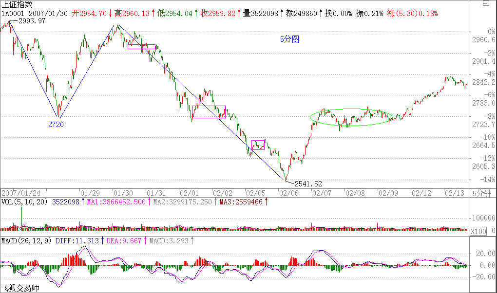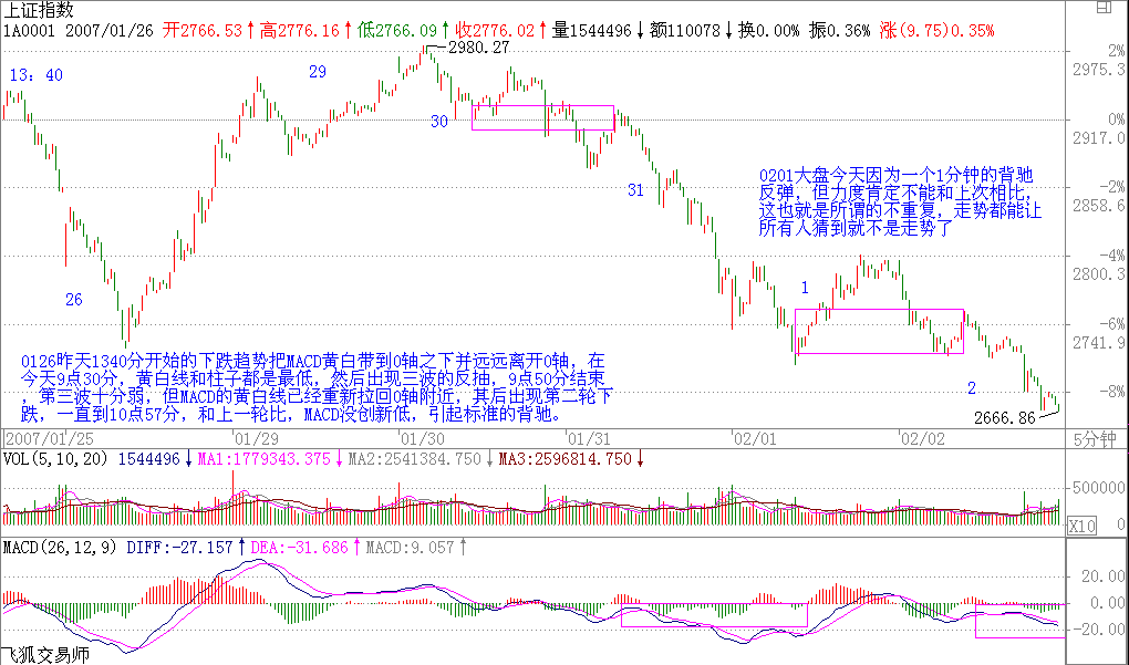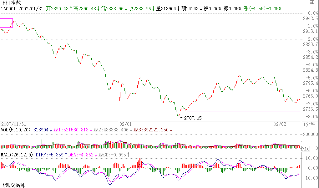 今天的走勢(shì)十分標(biāo)準(zhǔn)規(guī)范,只要對(duì)本ID的理論有一點(diǎn)了解的,都不難找到這個(gè)5分鐘背馳的底部。目前的事情很簡(jiǎn)單了,5分鐘背馳,一個(gè)大的阻力就是2720,這是上次的低點(diǎn),如果能上去,那周線的第一段就不會(huì)演化成下跌的趨勢(shì)(2007-02-02 15:20:44 這輪牛市的第一段都沒(méi)走完,什么叫基本走完?一個(gè)周線的調(diào)整很正常,又不是今天才說(shuō)的。這個(gè)調(diào)整的級(jí)別最多就是去年5月到8月那個(gè),8月以后是什么?),一個(gè)2720上下的周線中樞將逐步形成,否則,就有在下面形成下跌的第二個(gè)中樞的可能,這樣走勢(shì)壓力就比較大