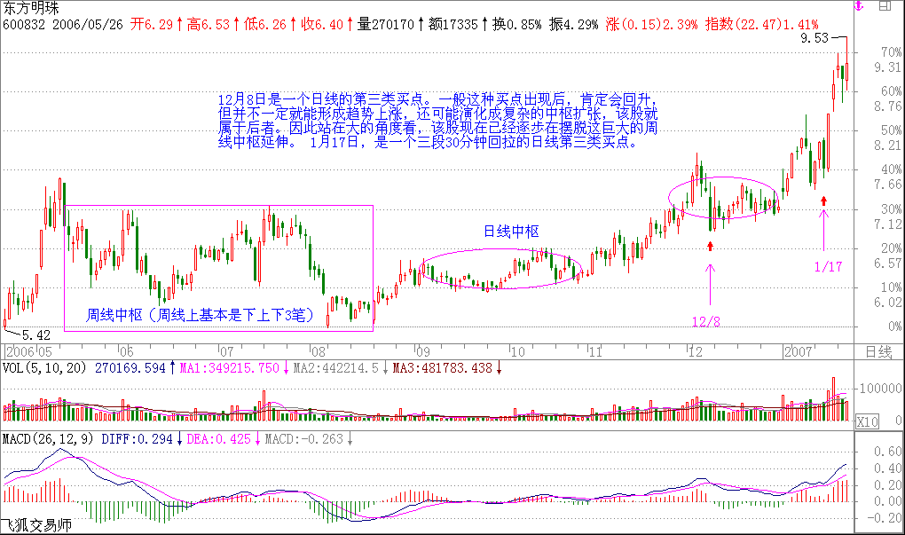 =====600832的走勢比較復雜,12月8日是一個日線的第三類買點。一般這種買點出現后,肯定會回升,但并不一定就能形成趨勢上漲,還可能演化成復雜的中樞擴張,該股就屬于后者。因此站在大的角度看,該股現在已經逐步在擺脫這巨大的周線中樞延伸。