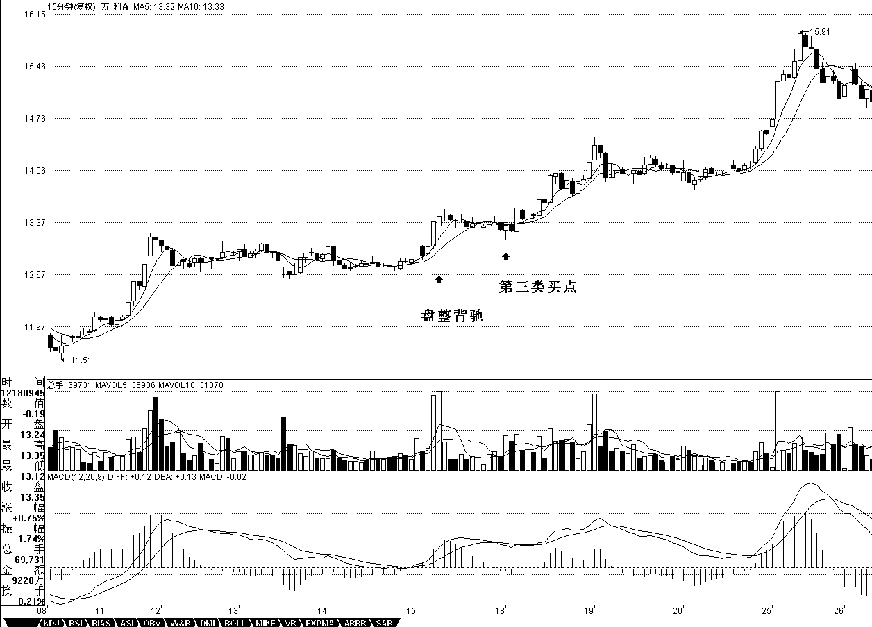 那么,有沒有盤整背馳后回跌形成第三類買點的例子,其實這種例子太多了,第三類買點,有一種情況就是這樣構成的。例如,000002萬科的15分鐘圖,12月15日10點45分,構成一個盤整背馳,所以要出來,其后的次級別回跌并不重新回到前面的中樞里,就在18日9點45分構成了標準的第三類買點,這時候就該重新回補了。