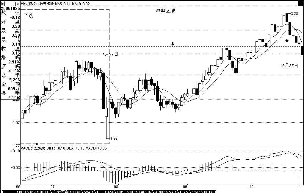 其后的上漲,對(duì)600497馳宏鋅鍺, 2005年7月27日到10月25日,明確地出現(xiàn)在日線上的上漲走勢(shì)(為什么?因?yàn)樵谌站€上明確地看到兩個(gè)CZSC走勢(shì)中樞)。而580991從2006年10月23日到12月13日,只構(gòu)成日線上的盤整走勢(shì)(為什么?因?yàn)樵谌站€上明確地看到一個(gè)CZSC走勢(shì)中樞)。(備注:580091配圖見前面15課后1219的回復(fù))