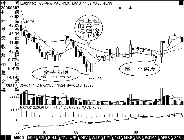 8月7日,男上位的第二次纏繞后下跌,但成交量等都明顯出現(xiàn)背弛,構(gòu)成小的空頭陷阱,成為第一個買點在41元附近。